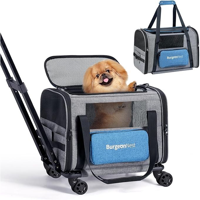 In addition to its practical design, the BurgeonNest Cat Carrier with Wheels includes a large pocket for storing pet essentials, making it ideal for travel and vet visits. The carrier is durable, lightweight, and well-ventilated, providing a safe and comfortable space for your furry friend on the go. Overall, this carrier offers a practical solution for pet parents looking for a convenient way to transport their small dog or cat. Description by ChatGPT.