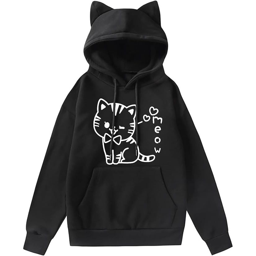 Cat hoodies for women and teen girls are a popular fashion trend that combines style and comfort. These hoodies typically feature adorable cat-themed designs such as ears on the hood or printed cat faces. They come in a variety of styles, from pullover to zip-up, and are made from materials like cotton, polyester, or fleece for warmth and softness.