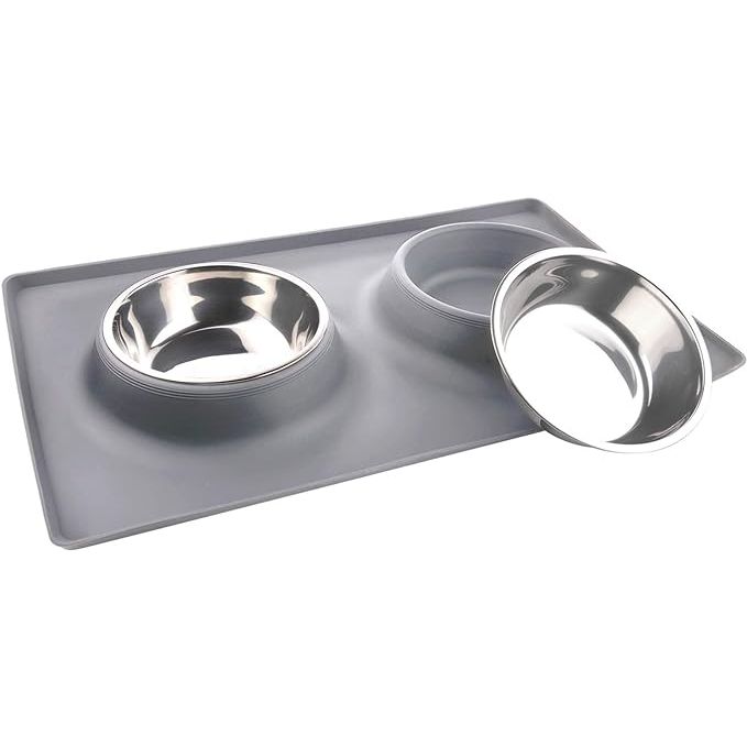 The bowls are made of high-quality, durable stainless steel that is resistant to rust and scratches, ensuring long-lasting use. The silicone mat features raised edges that help prevent spills and keep the bowls in place during meal times. The square design and grey color of the set also add a touch of style to your pet's feeding area.