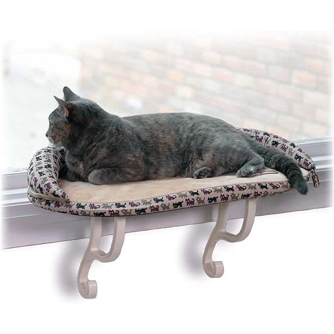 K&H Pet Products Deluxe Kitty Sill w/ Bolster Cat Window Bed, Cat Window Perch for Large Cats, Cat Window Hammock, Cat Window Seat, Window Cat Bed, Cat Perch Cat Hammock –Tan Kitty Print