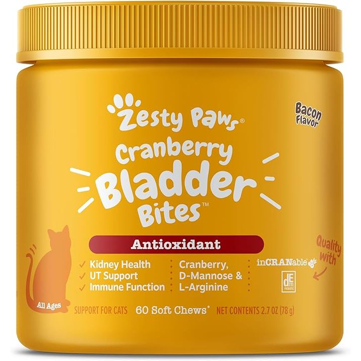 Zesty Paws Cranberry Bladder Bites for Cats are soft chews specifically formulated to support kidney and urinary tract health in cats. These chews contain ingredients like cranberry, D-Mannose, Vitamin B6, and L-Arginine, which work together to promote a healthy urinary system and prevent urinary tract infections. Cranberry is known for its ability to help flush out bacteria in the urinary tract, while D-Mannose promotes a healthy bladder lining.