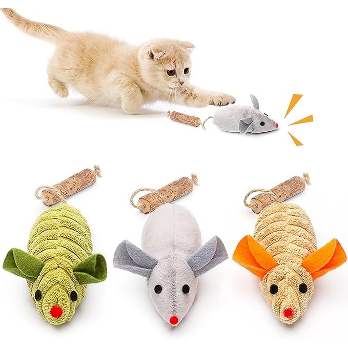 Make playtime fantastic for your feline friend with these plush squeaking mice toys. The lifelike mouse chirping sounds will beckon every bat, bite, chew, and chase, keeping your cat entertained for hours. The toys are stuffed with 100% pure, potent, and organic catnip, as well as silvervine tails to maximize your cat's excitement during playtime.