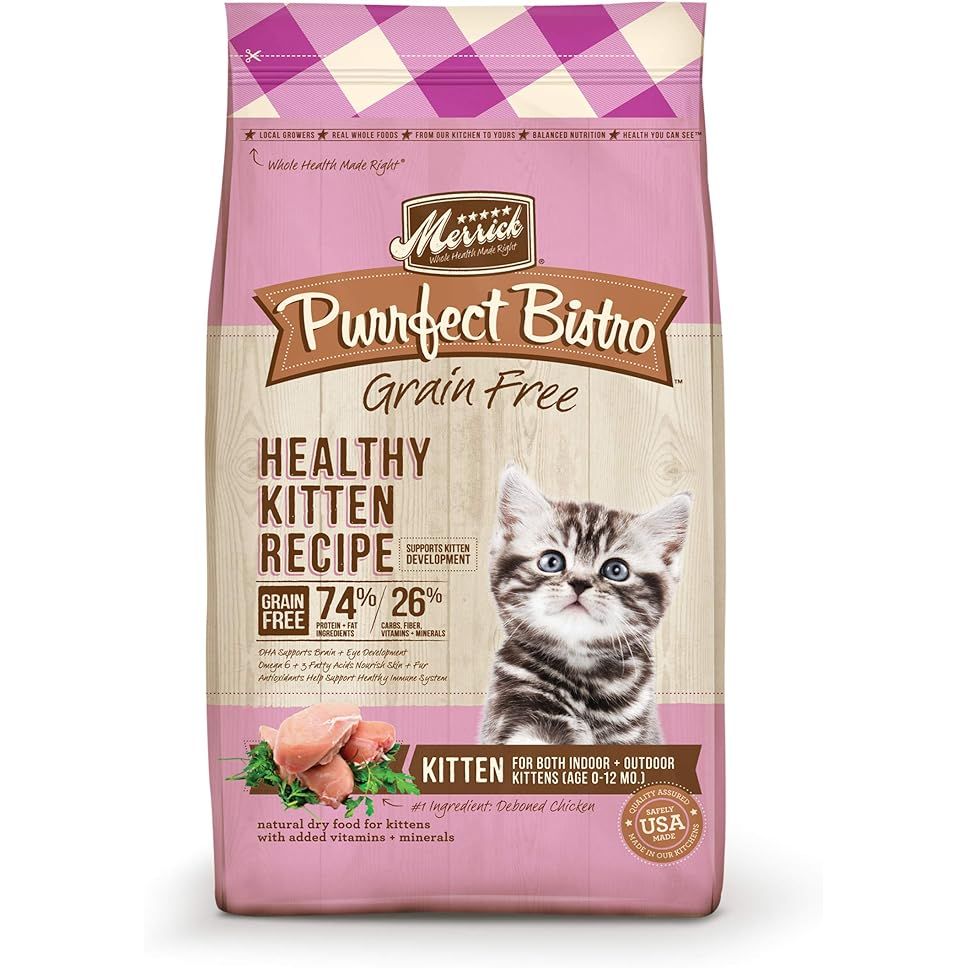 Made with real deboned chicken as the first ingredient, Merrick Purrfect Bistro Premium Grain Free Natural Dry Cat Food offers a protein-rich diet that satisfies a cat's natural carnivorous cravings. This recipe also contains a blend of vitamins, minerals, and antioxidants to support overall health and well-being for young cats. With no artificial colors, flavors, or preservatives, pet owners can feel confident feeding their kittens this premium quality cat food option. Description by ChatGPT.