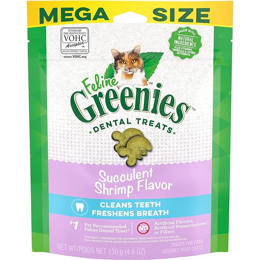 Greenies Feline Adult Natural Dental Care Cat Treats in Succulent Shrimp Flavor are a delicious and nutritious way to help support the dental health of your feline friend. These treats are specially designed to help reduce tartar and plaque buildup, promoting healthier gums and fresher breath.