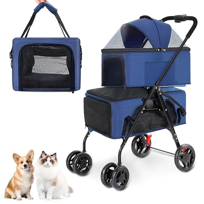 When not in use, the Double-Layer Pet Stroller can be easily folded into a compact size for storage or transportation in a car trunk. With its multi-functional design, this pet stroller can also be used as a pet backpack or booster car seat, making it a versatile and practical option for pet owners on the go. Whether you're running errands or going on outdoor adventures, this stroller is sure to make traveling with your furry friends a breeze. Description by ChatGPT.