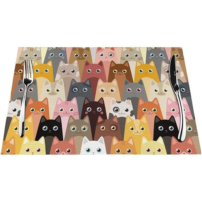 The 4PCS Cat Table Placemats are a set of four placemats designed for use on dining tables. Each placemat measures 12x18 inches, providing ample space for a plate, utensils, and glass. Made of PVC material, these placemats are washable, making them easy to clean and maintain hygiene in the dining area.