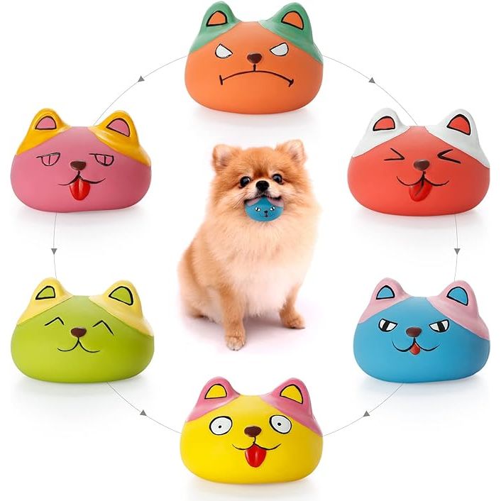 Squeaky Dog Toys Funny Animal Dog Balls for Puppy Small Pet Dogs 6 Pcs/Set (Cat) is a set of six small squeaky toys designed for small pets, particularly puppies. The toys are shaped like different animals, such as cats, and are brightly colored for visual stimulation. Each toy is made of soft and durable material to withstand chewing and play.