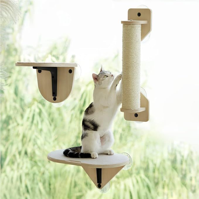 MEWOOFUN Cat Window Perch Hammock with Climbing Steps and Scratching Post Wooden Window Mounted Cat Bed for Indoor Cats (3 Pcs Cat Climber Set)