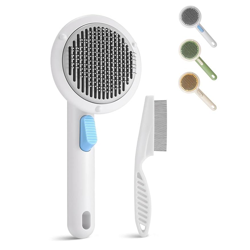 Cat Hair Brush with Release Button, RIFNEEIM Pet Self Cleaning Slicker Brush for Shedding and Grooming, Mats Tangled Hair Shedding Brush with Cat Flea Comb White