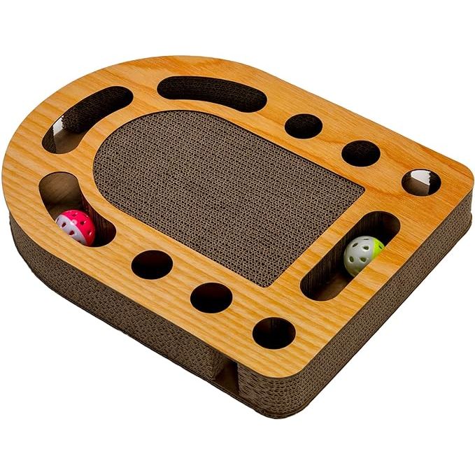 The scratching pad is made of durable corrugated cardboard that helps to promote healthy scratching habits and keep your furniture safe. The ball track adds an element of fun and mental stimulation for your cat, while the included catnip entices them to play and explore the toy. This one-size toy is suitable for cats of all ages and sizes, providing them with hours of entertainment and exercise.