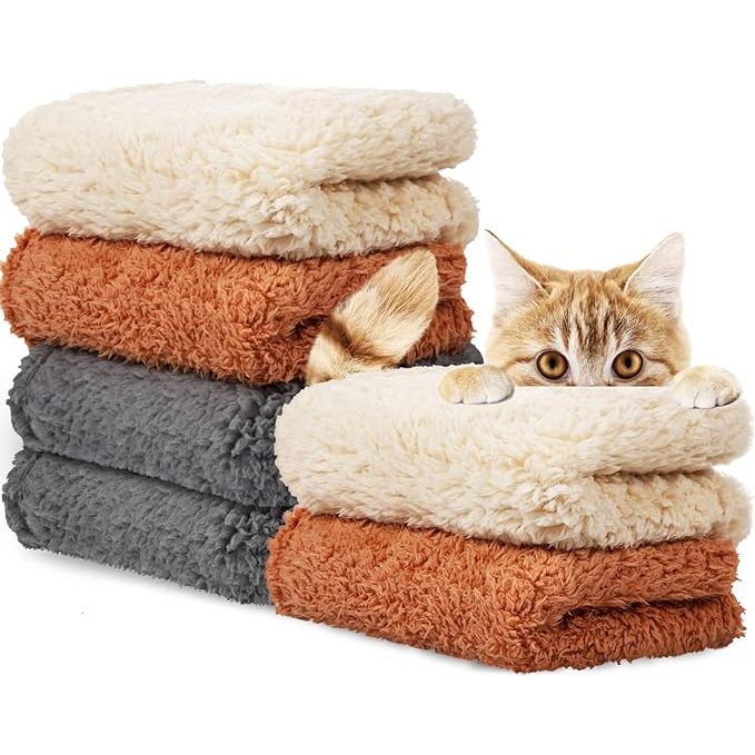 The Newwiee 6 Pcs Calming Blankets are designed for small to medium-sized dogs and cats to provide them with a soft and warm blanket for comfort and relaxation. These blankets are made of fluffy fleece, creating a cozy and soothing environment for pets to snuggle up in. The blankets come in a pack of six, with three different neutral colors (gray, beige, khaki) to choose from, giving pet owners options to match their home decor.