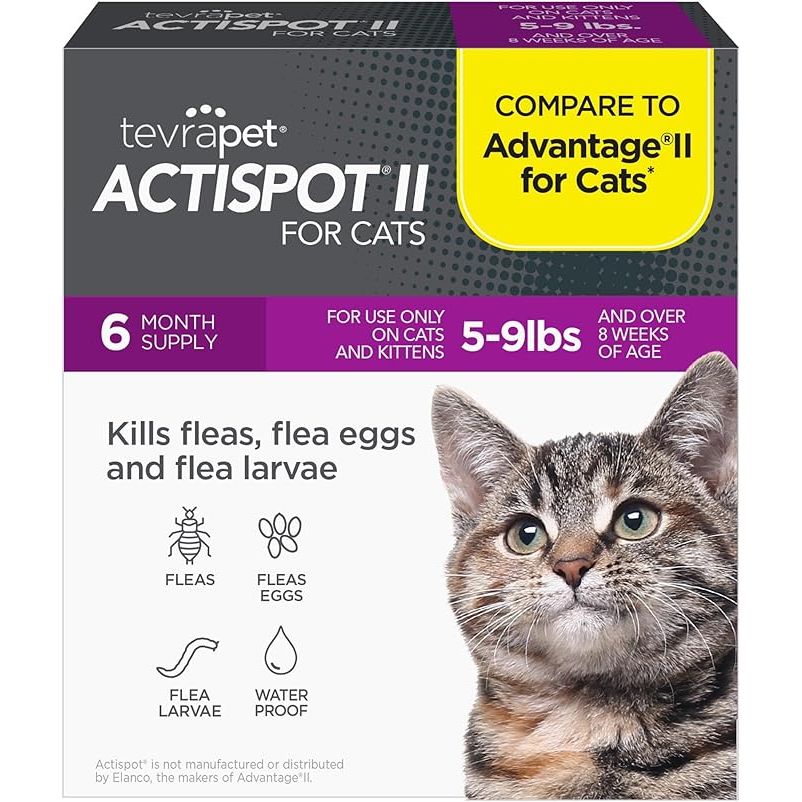 TevraPet Actispot II is a flea treatment specifically designed for small and medium cats weighing between 5-9 lbs. It comes in a pack of 6 doses, providing powerful prevention and control of fleas on your feline companion. The formula is fast-acting and long-lasting, providing up to one month of protection against fleas.
