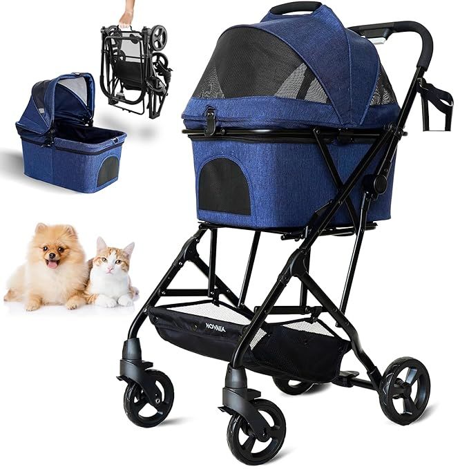 HOVNIA 3 in 1 Dog Stroller, Lightweight Foldable Pet Stroller, 4 Wheels Dog Cat Stroller with Removable Travel Carrier, No-Zip Canopy, Cup Holder, Large Storage Basket for Small Pet - Blue