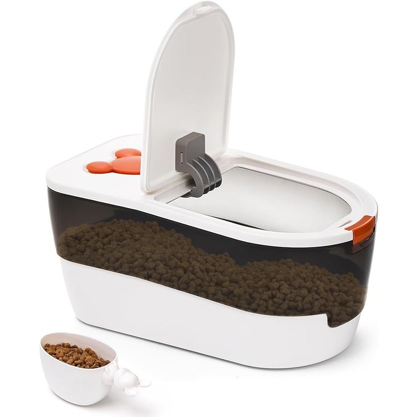 This storage bin can hold up to 7-10 lbs of dry food, making it suitable for small to medium-sized pets. It comes with a convenient scoop that can be attached to the lid for easy access. The container is also stackable, allowing you to save space in your pantry or kitchen.